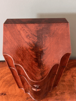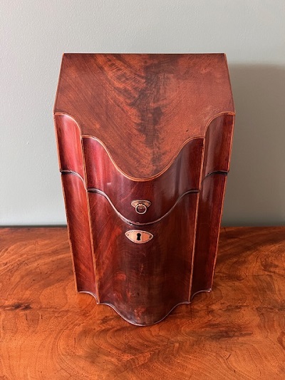 A good late 18th century George III figured mahogany serpentine form “knife Box” – boxwood and ebony “compass star” inlay to underside of top.