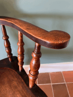 A late Victorian beech Smoker’s Bow elbow chair with alder seat – lovely shaped top rail and turned double “H” stretchers for strength.