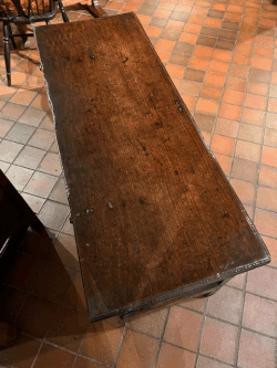 A good late 17th century oak coffer with wonderful carved roundels to panels – later hinges and an old repair to rear left hand side of top.