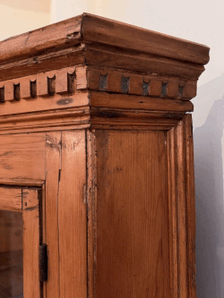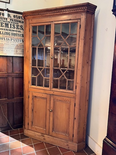 A mid 19th century pine corner cupboard of relatively small proportions ideal for a cottage – the dentil cornice over a pair of astragal glazed door that open out to an interior with shaped shelves above lower panel doors. This is one piece.