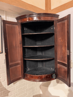 A late 18th century mahogany bow fronted hanging corner cupboard – the dentil cornice over a figured frieze with “dog tooth” boxwood inlaid decoration. The figured doors open to reveal an interior fitted with 3 oak lined spice drawers.