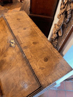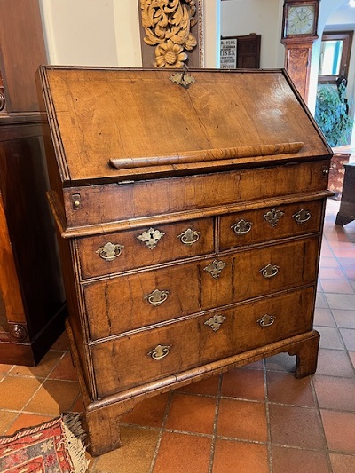 An early 18th century figured walnut bureau of small proportions crossbanded and herringbone inlaid. The “fall” with lectern book rest opens to reveal an interior fitted with a “well” giving access to the compartment above the drawers. The oak lined drawers also herringbone inlaid – the brass handles and escutcheons are of a later date as are the feet.