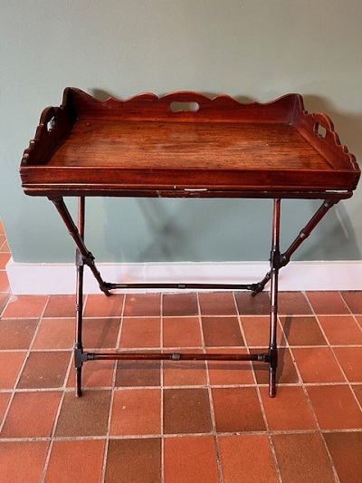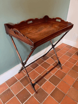 A Regency mahogany Butler’s tray on a folding stand – the tray with shaped gallery and cut-out handles. Often used for serving and could be easily stored when not in use.