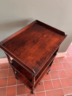 An early 19th century William IV rosewood 3 tier Whatnot fitted with a base mahogany lined drawer bearing “maker’s” / retailer’s stamp “James Winter 101 Wardour St London – on turned lobed feet and brass castors.