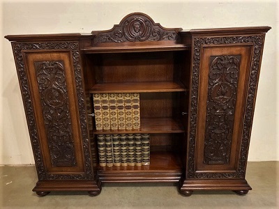 A beautiful quality early 20th century inverted breakfront mahogany side cabinet / bookcase with crisp carved detail throughout - mask roundel above a the central open section with 2 shelves flanked to by 2 carved panelled doors.