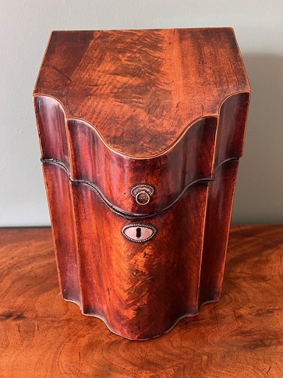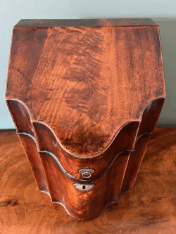 A good late 18th century George III figured mahogany serpentine form “knife Box” – the interior has since been removed – boxwood and ebony “compass star” inlay to underside of top.