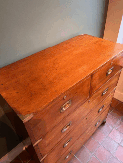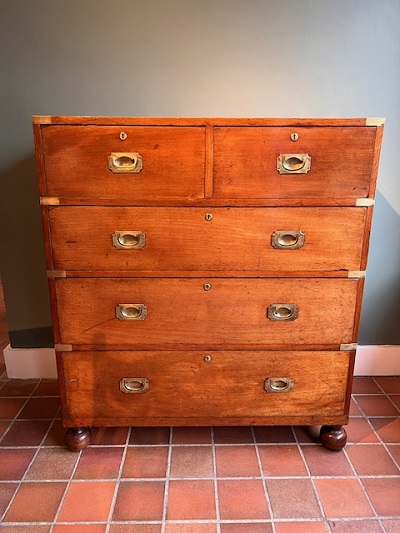 A late Victorian teak and brass bound Campaign chest of drawers made in two sections with countersunk brass handles to the ash lined drawers – often seen without carrying handles as were often transported in packing cases with rope handles. Raised on later turned feet. Being made in two sections enables one to navigate difficult staircases etc.