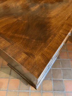 An early 18th century beautifully figured walnut chest of 2 short and 3 full width pine lined drawers – the later quarter veneered top crossbanded and herringbone inlaid over drawers again, herringbone inlaid and with replacement brass drop handles and escutcheons. May well have originally stood on a stand , but the stands being of solid walnut and susceptible to woodworm were then often found to be raised on later turned feet.