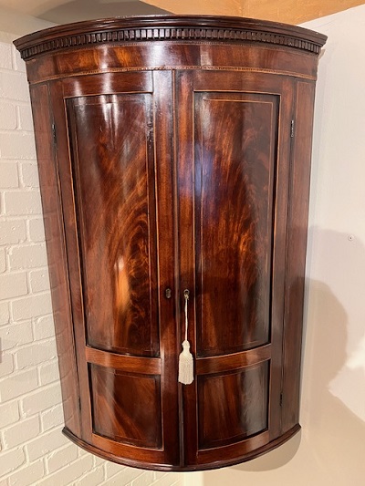 A late 18th century mahogany bow fronted hanging corner cupboard – the dentil cornice over a figured frieze with “dog tooth” boxwood inlaid decoration. The figured doors open to reveal an interior fitted with 3 oak lined spice drawers.