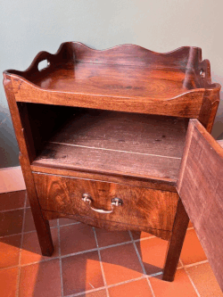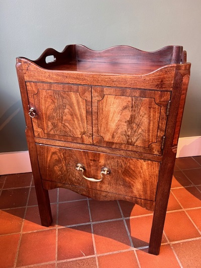 A late 18th century George III mahogany tray-top bedside cabinet of a wonderful colour with shaped pierced gallery over a beautifully figured mahogany double panel door inlaid with ebony line stringing – over a later converted drawer.