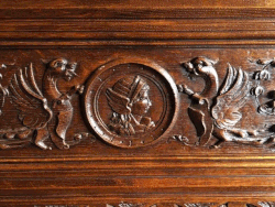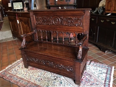 A late Victorian oak box settle / hall seat with beautiful crisp carved detail in the Renaissance style with portrait roundel flanked by mythical creatures – linenfold side panels and acanthus carved arms (old repair to left arm support).