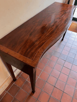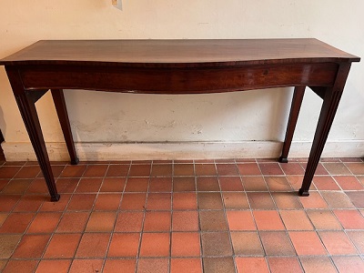A late 19th century Georgian style mahogany serpentine form Serving table - the figured top with contrasting figured wide banding and boxwood and ebony strung detail - on tapering fluted legs and block feet.