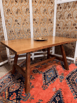 A mid 20th century Arts & Crafts design solid oak table with splayed legs and an elbow chair - the top with inset “butterflies” to the board ends that as well as being an aesthetic feature also restricts any movement of the boards. Carved incised cabinetmaker’s monogram to the underside of top and also to the underside of the chair. Again, nice detail to scrolled back of chair and to the arm supports.