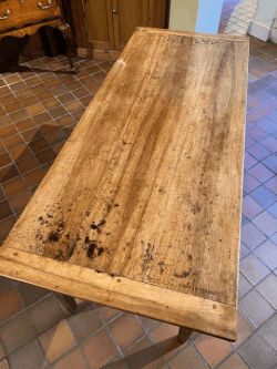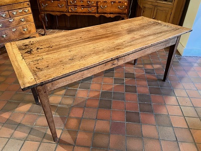 A mid 19th century French Provincial Farmhouse fruitwood table - the top of 3 boards with cleats and an end drawer ( historic worm to drawer / treated ).
